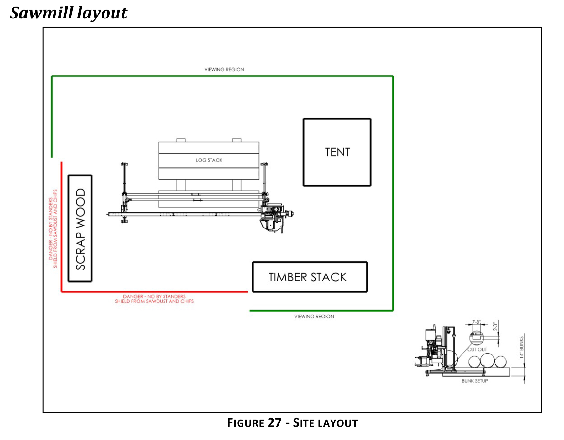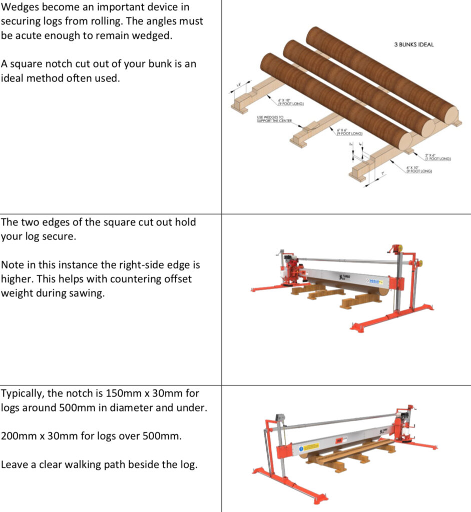 La conception de la scierie permet un accès facile à votre chantier. Les grumes mesurant jusqu’à 5,2 m de long et jusqu’à 1,5 m de diamètre, voire plus sont préparées sur une plateforme aussi plane et propre que possible. Pensez à un espace pour la gestion des grumes, du bois coupé, des résidus, etc. en fonction des moyens mis à disposition: équipe aidante et engin de levage.